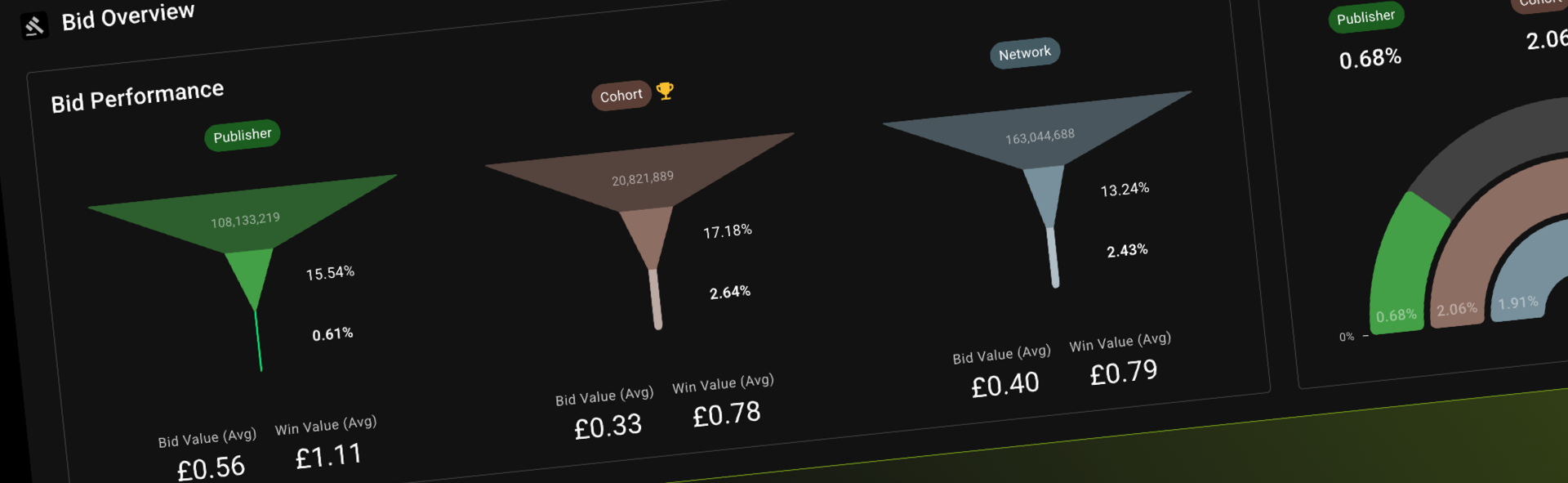 The Bid Overview combines all SSPs in the mix to show how the bid stream flows across each benchmark group, highlighting which performs best based on win rate. The view follows the bid funnel from requests through to winning bids, with revenue efficiency plotted for each group to identify the most effective SSP demand setup.
