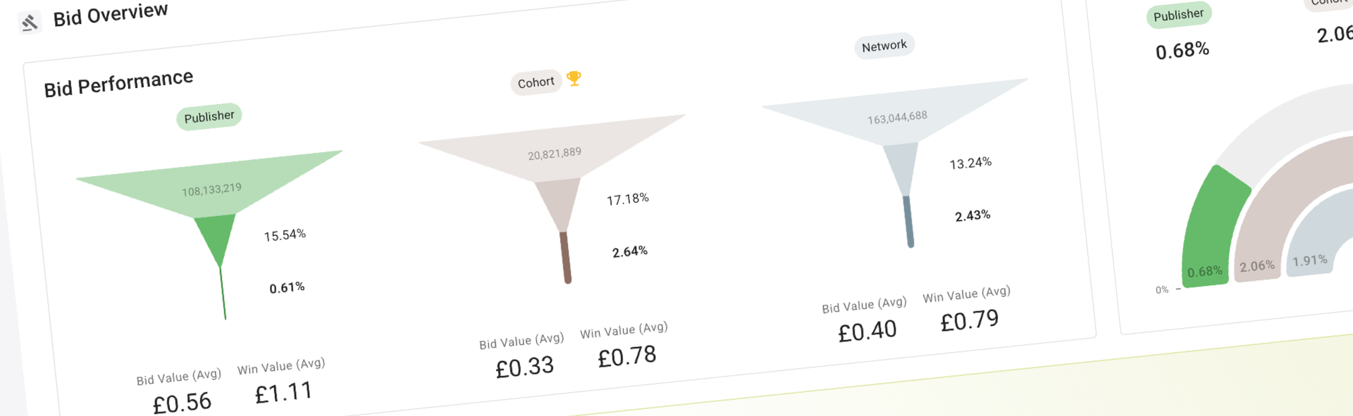 The SSP Partners section provides insight into how your SSP partners are performing, including overall bid rates and a detailed SSP-by-SSP breakdown. Comparing these metrics with your cohort and the wider network helps you spot gaps, identify top-performing partners, and uncover opportunities to optimise your bidding strategy.