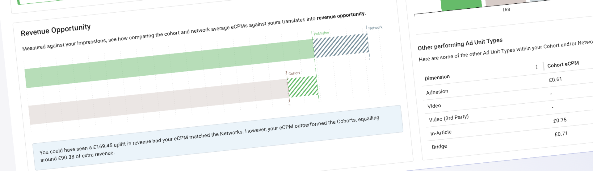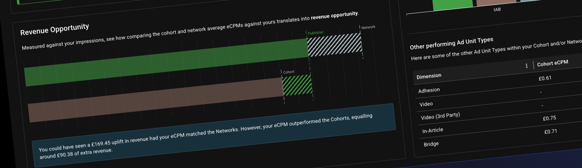 The Opportunity section highlights how differences in CPM can translate into over or underperforming revenue. Using your impressions and benchmark CPMs, it visualises potential revenue gains or losses through clear bar charts – showing how even small CPM improvements can lead to measurable uplift.