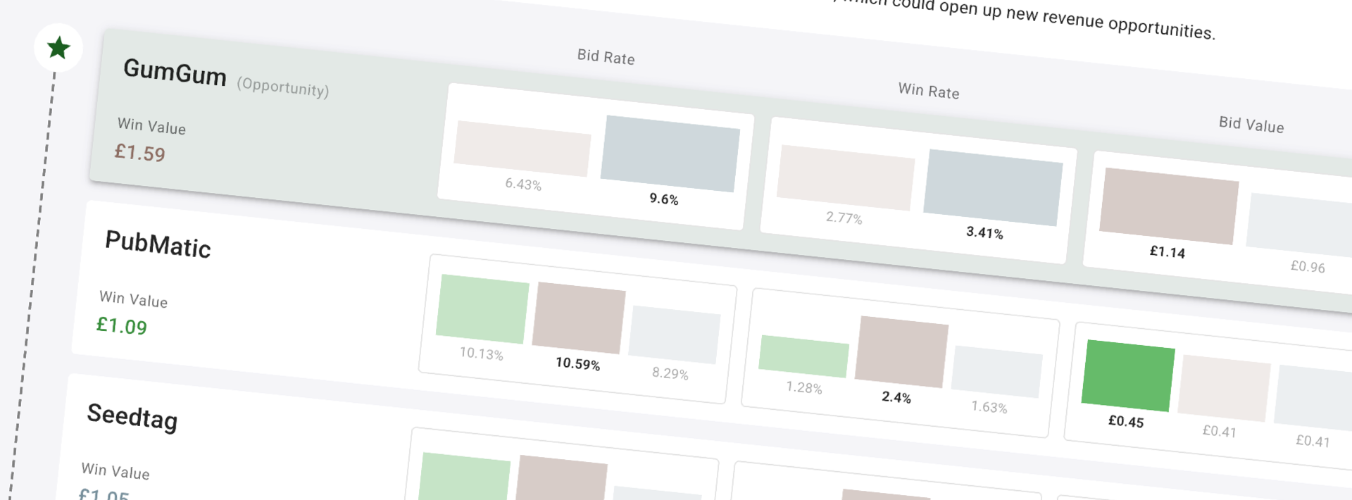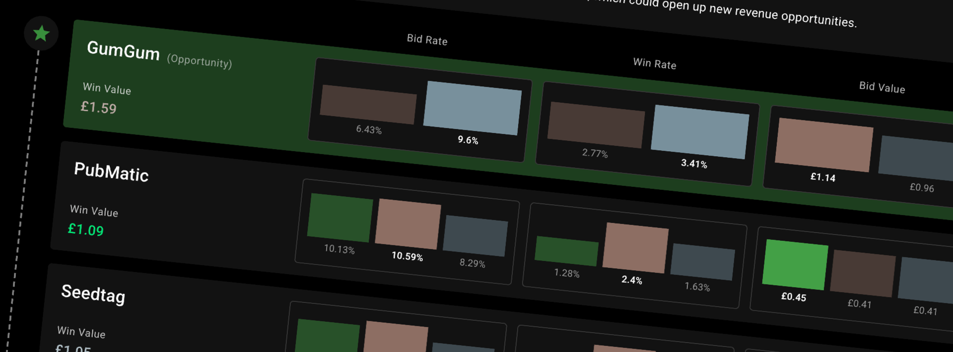 You can sort the list by the metric that matters most to you, giving a clear, top-to-bottom view of how each SSP performs within your setup. Alongside your own partners, you’ll also see other high-performing SSPs from the cohort and network that aren’t currently in your stack – highlighting potential opportunities to expand and optimise your demand mix.